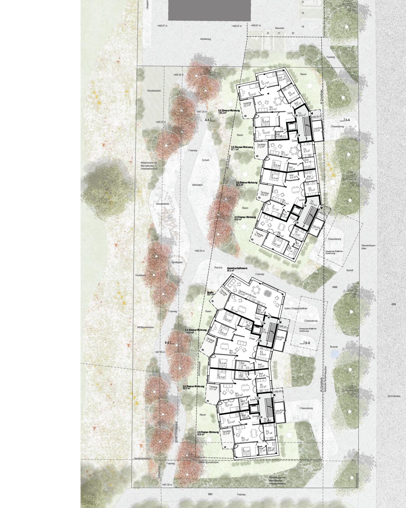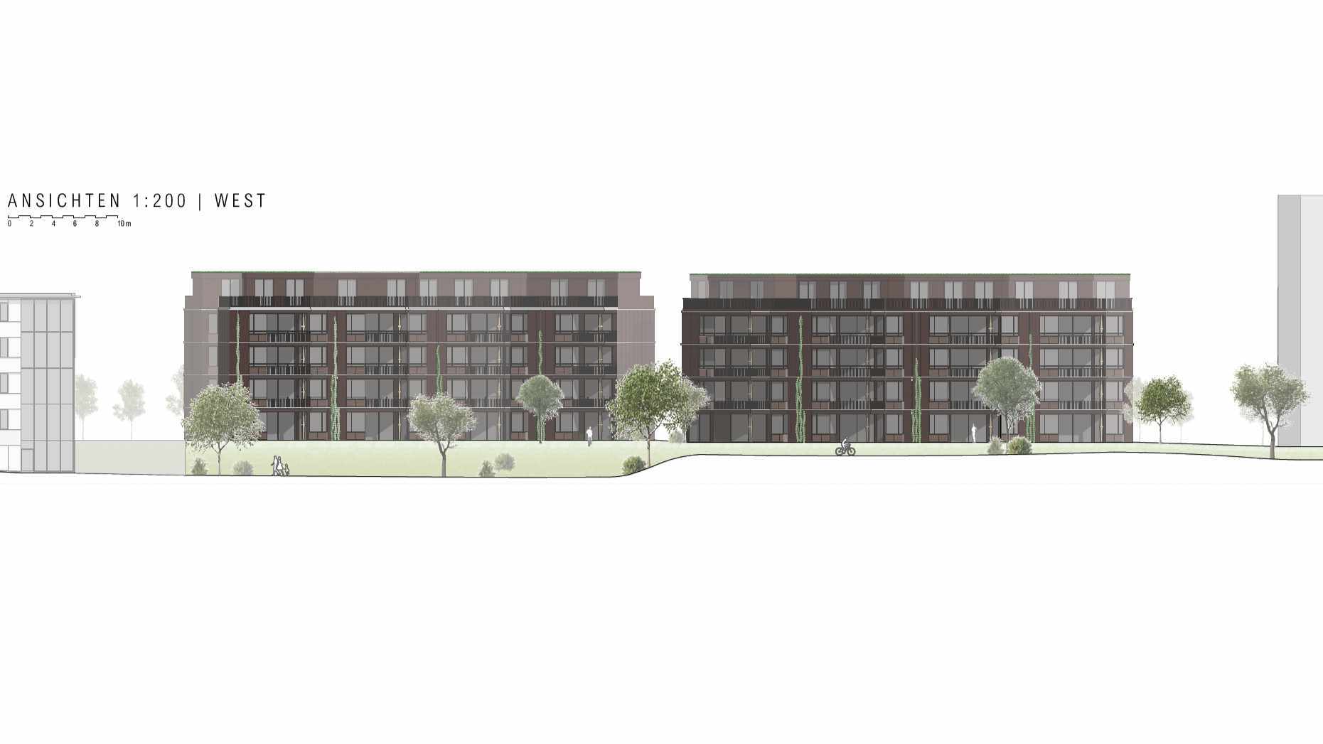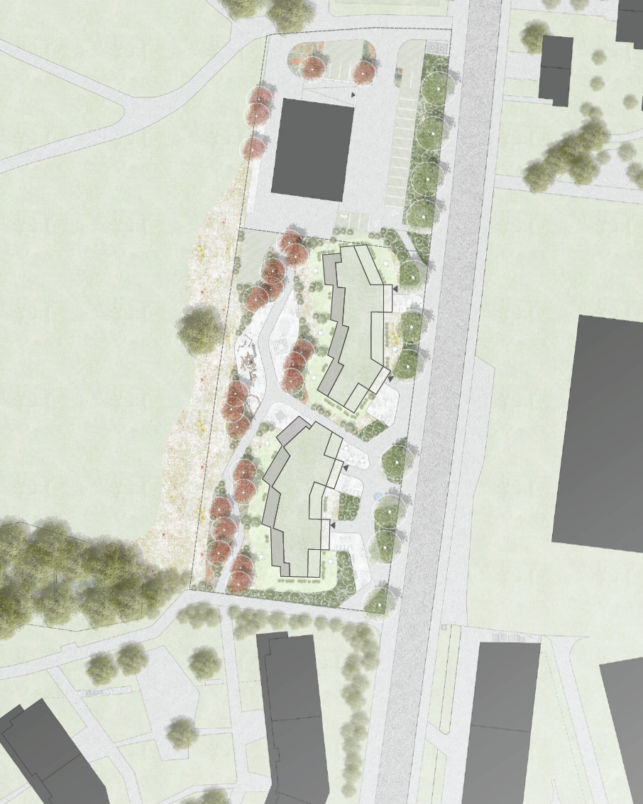 Das Projekt reagiert auf das heterogene Umfeld mit zwei langgestreckten Volumen, die sich in das bestehende Straßen- und Grünraumgefüge einfügen. Durch Knicke und amorphe Formgebung entstehen offene Zwischenräume und klare Durchwegungen. Im Süden wird die Verbindung zur Grünstruktur durch eine weichere Formensprache gestärkt, im Norden durch präzise Setzungen und Anknüpfungen an den Bestand. Die Setzung der Baukörper berücksichtigt Lärmschutz, Belichtung und Privatsphäre. Durch die Staffelung und Orientierung entstehen individuelle Loggien mit Blick in die Natur und gute natürliche Belüftung. Der städtebauliche Ausdruck ergibt sich aus dieser differenzierten Reaktion auf Kontext, Lärm und Landschaft.