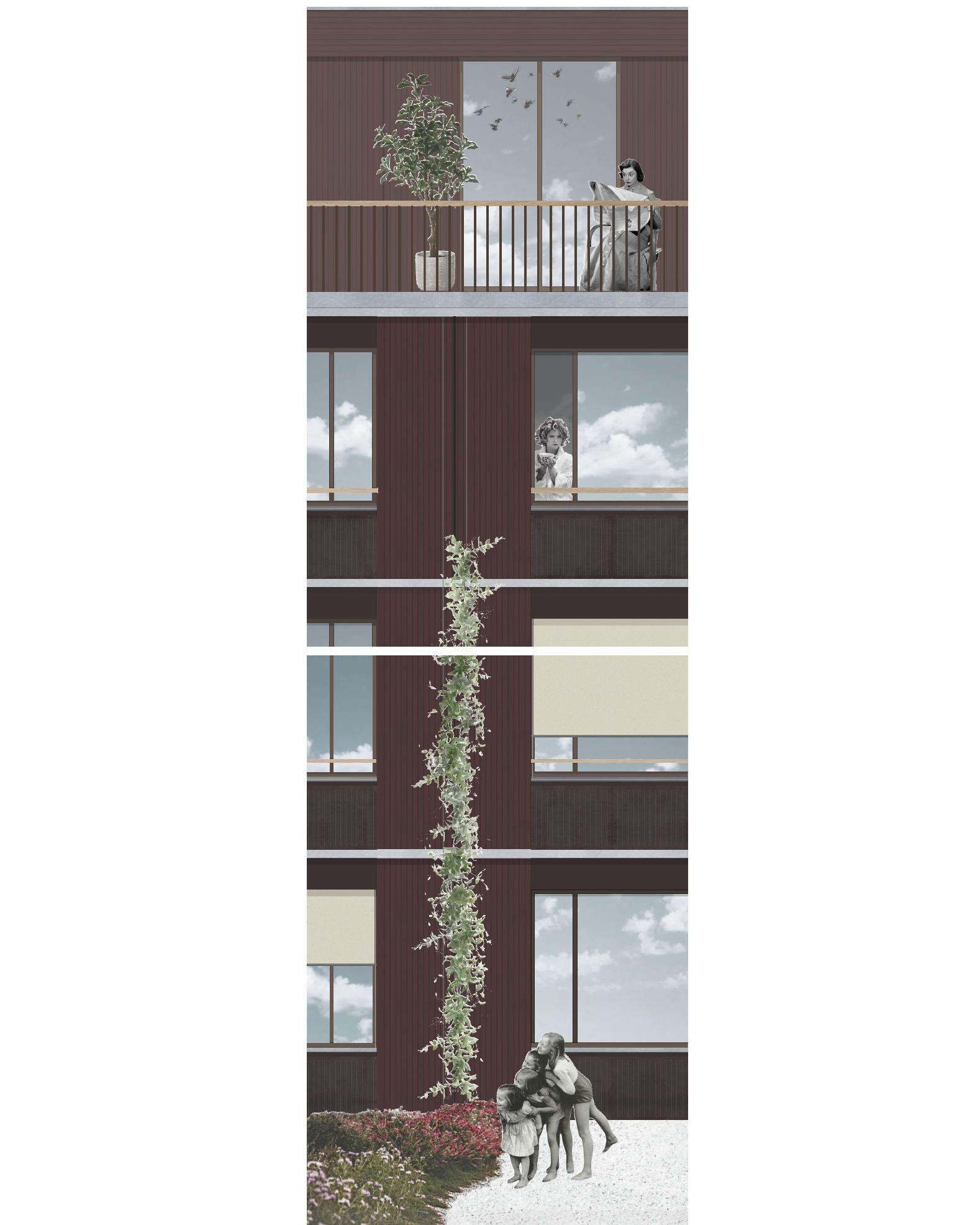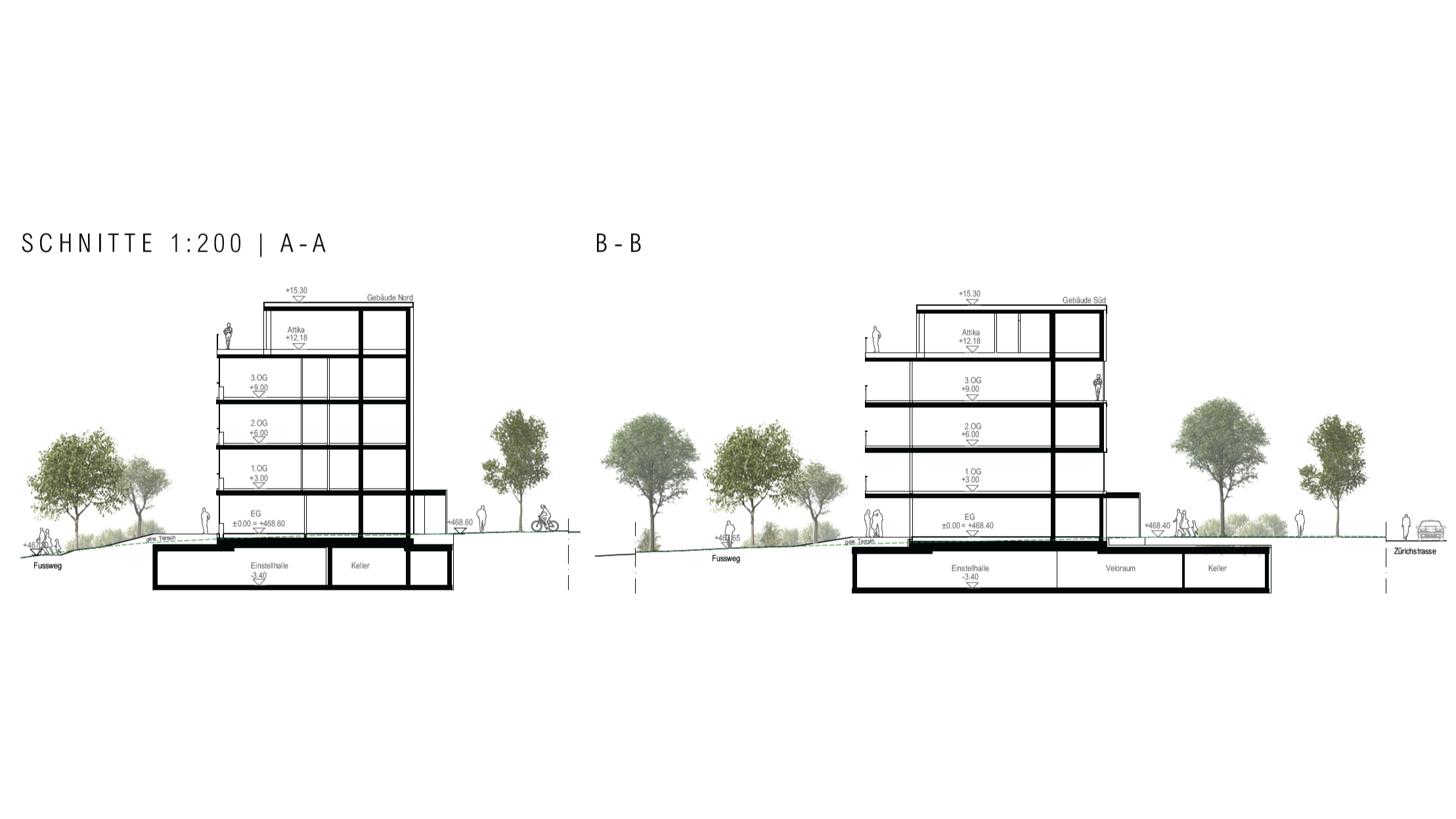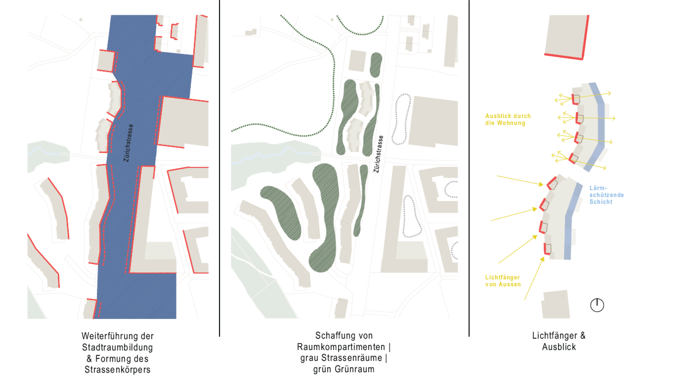 Das Projekt reagiert auf das heterogene Umfeld mit zwei langgestreckten Volumen, die sich in das bestehende Straßen- und Grünraumgefüge einfügen. Durch Knicke und amorphe Formgebung entstehen offene Zwischenräume und klare Durchwegungen. Im Süden wird die Verbindung zur Grünstruktur durch eine weichere Formensprache gestärkt, im Norden durch präzise Setzungen und Anknüpfungen an den Bestand. Die Setzung der Baukörper berücksichtigt Lärmschutz, Belichtung und Privatsphäre. Durch die Staffelung und Orientierung entstehen individuelle Loggien mit Blick in die Natur und gute natürliche Belüftung. Der städtebauliche Ausdruck ergibt sich aus dieser differenzierten Reaktion auf Kontext, Lärm und Landschaft.