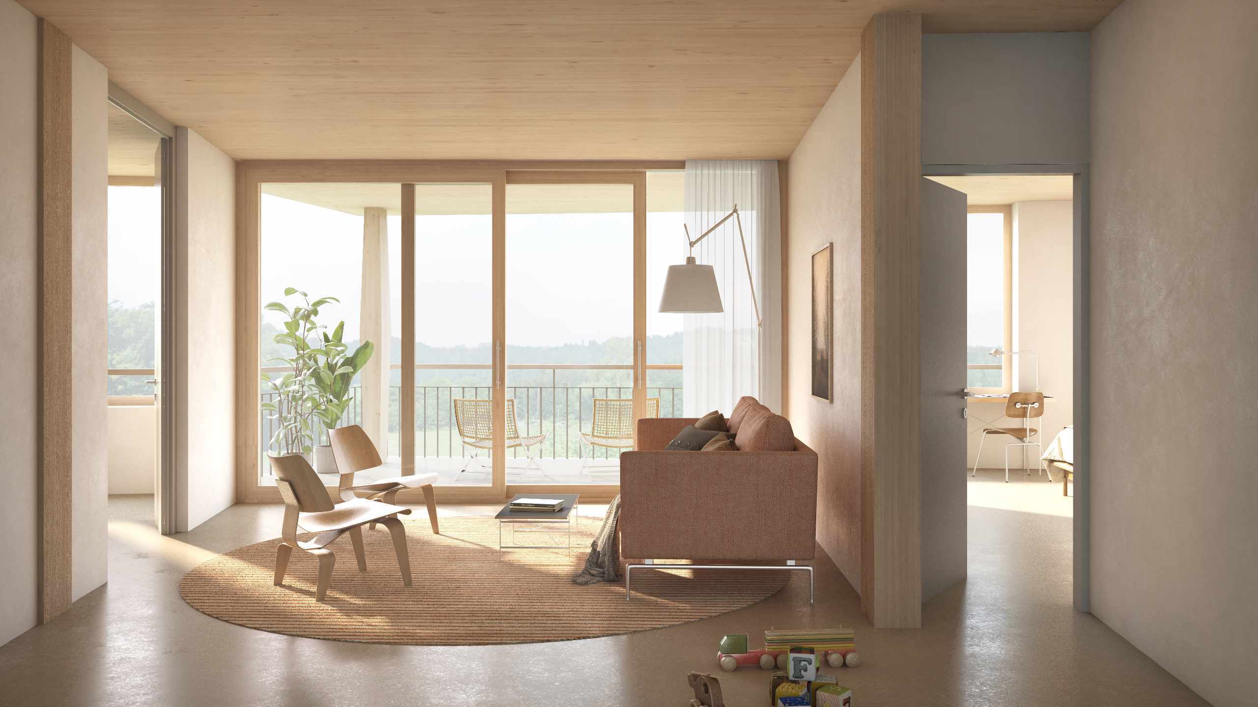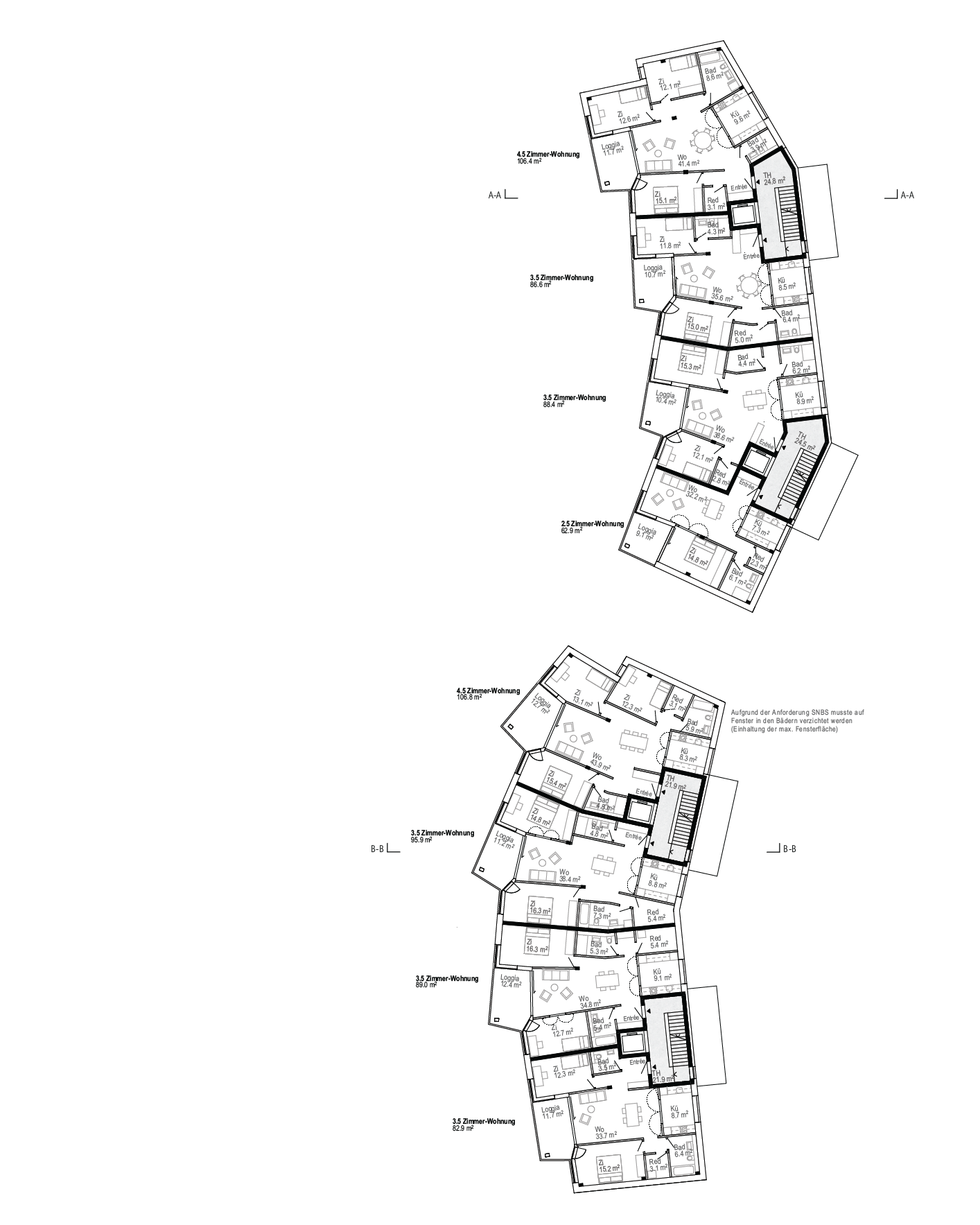 Die Wohnungen sind durchgesteckt mit Ost-West-Ausrichtung und optimaler Belichtung. Essräume, Küchen und Bäder liegen an der Fassade mit großzügigen Fenstern. Die Grundrissstruktur basiert auf linearer Organisation mit fließenden Übergängen zwischen öffentlichen und privaten Zonen. Loggien und Rücksprünge in der Fassade schaffen geschützte Außenräume. Im Erdgeschoss erweitern sich die Wohnungen in den Garten, in den Obergeschossen durch private Loggien. Ein Gemeinschaftsraum liegt zentral zwischen den beiden Baukörpern und verbindet die Wohnbereiche.