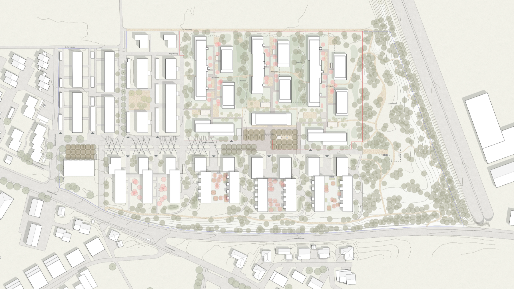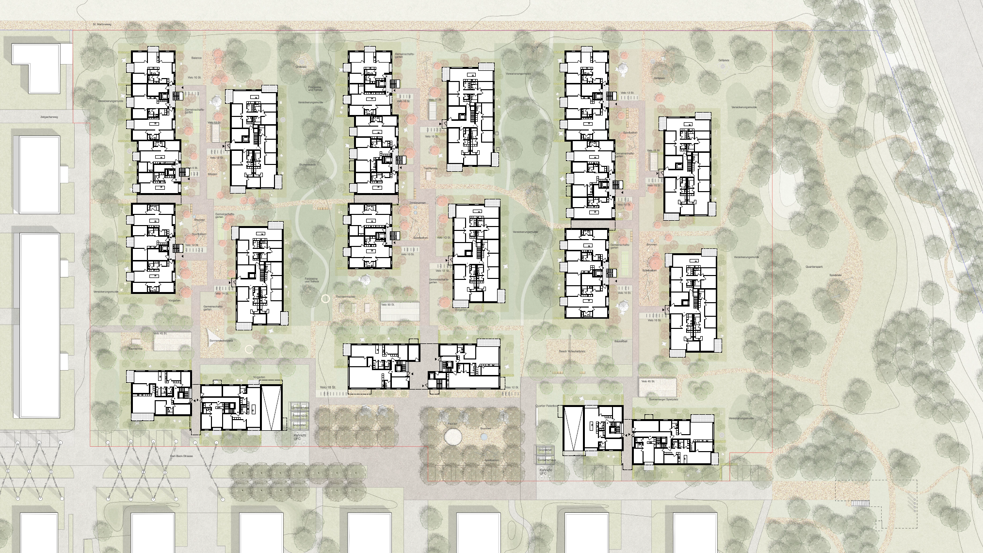 Der umliegende Grün- und Parkraum zieht sich sanft ins Quartier hinein und schafft harmonische Übergänge zwischen Natur und Architektur. Aufweitungen und Sichtachsen erlauben den Bewohnern, stets einen Bezug zur Landschaft zu haben, während zurückversetzte Dachgeschosse spannende Akzente setzen und Ausblicke in die Umgebung eröffnen.