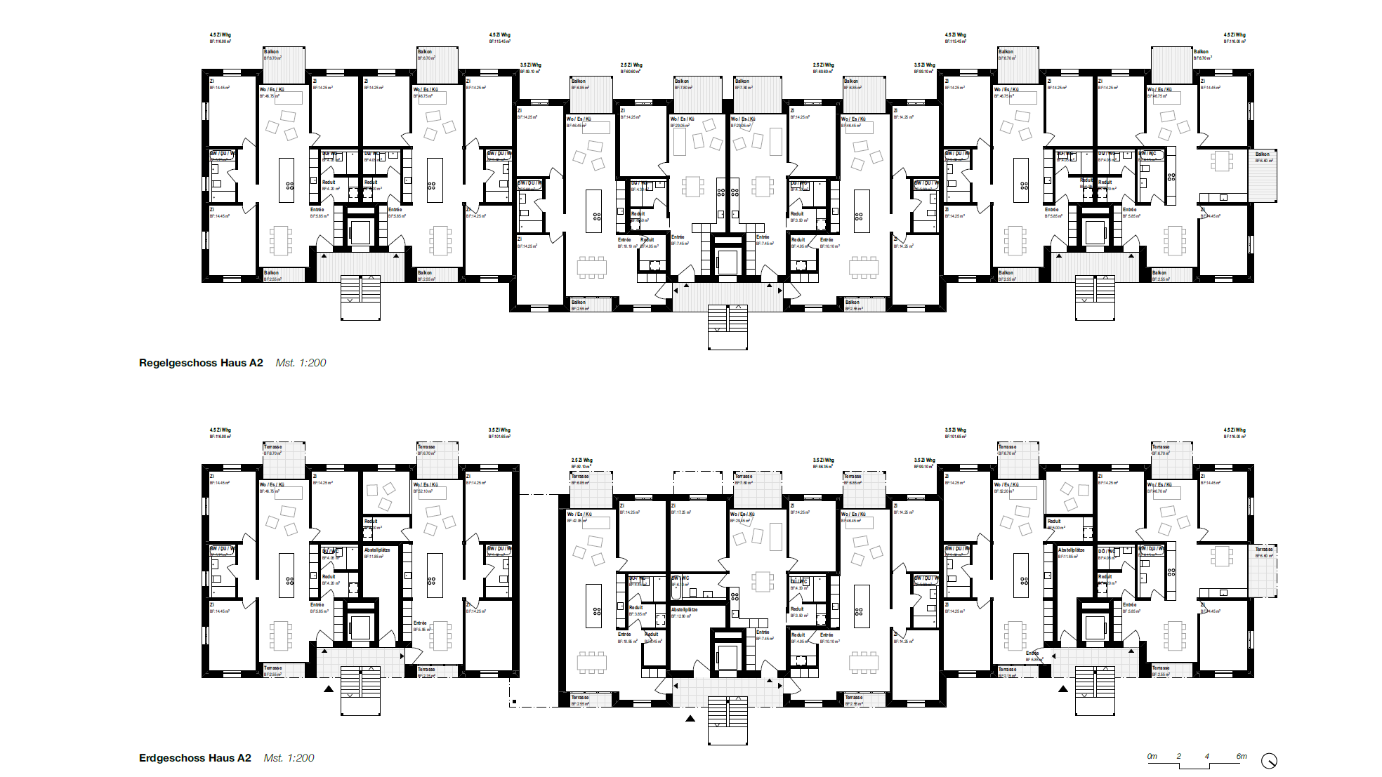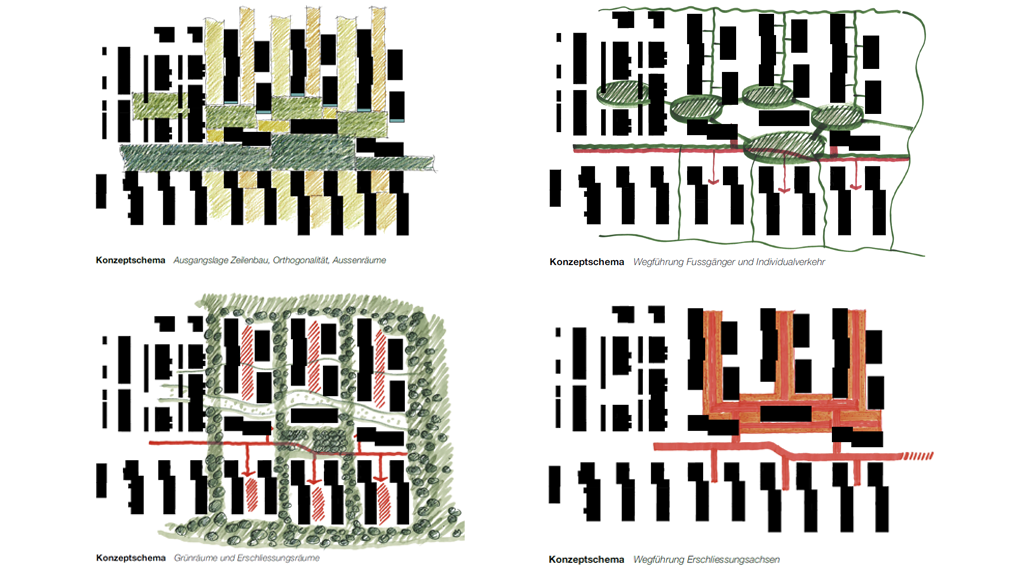 «Unser städtebaulicher Ansatz greift das Prinzip des Zeilenbaus auf, löst sich jedoch von der einheitlichen Anordnung und entwickelt die Zeilenbauten teilweise zu freistehenden ‹Einzelbauten› weiter.»