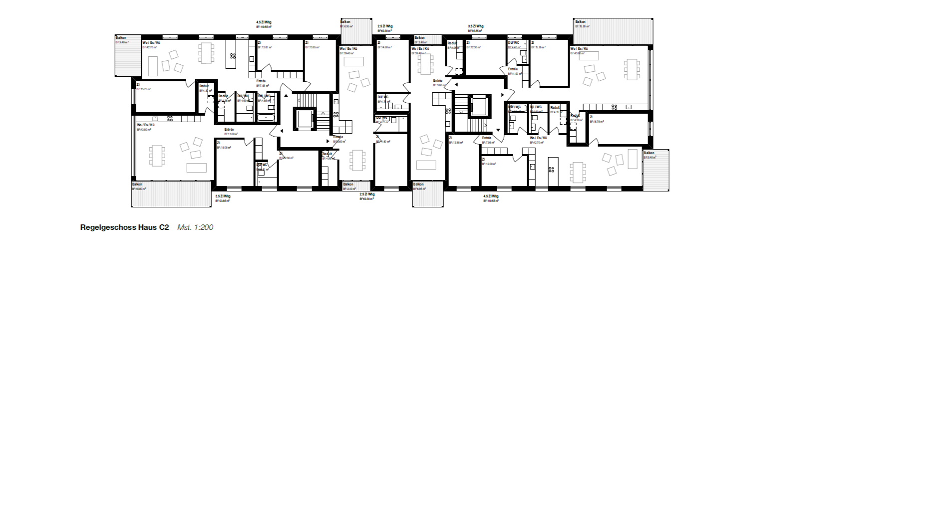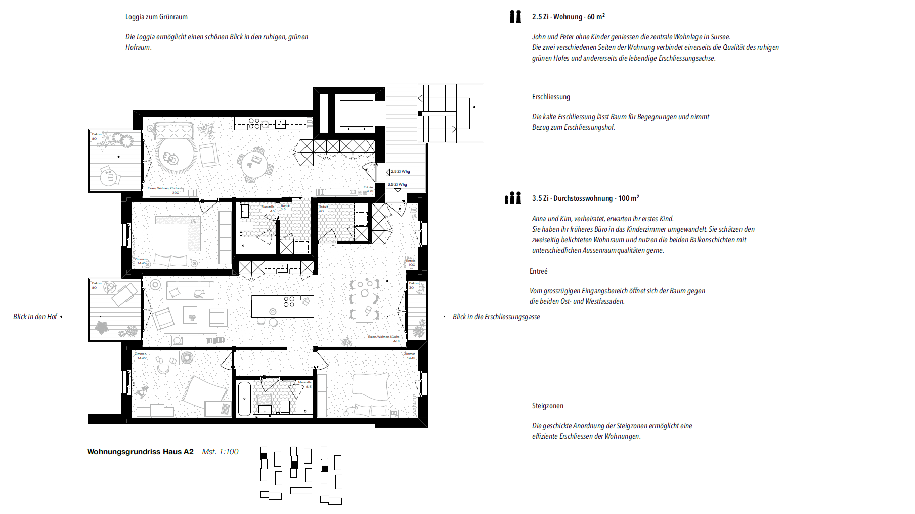 Dieser Platz öffnet sich fließend in halböffentliche Räume, deren unregelmäßige Anordnung an eine spielerische Klaviatur erinnert. Der Blick schweift mal zum nahen Wald, mal in die Tiefe des Quartiers, das durch diese räumliche Vielfalt eine besondere Dynamik erhält. Unterschiedliche Gebäudetypen und vielseitige Grundrisse ermöglichen eine breite Palette an Wohnformen und flexible Nutzung für Mieter und Käufer.