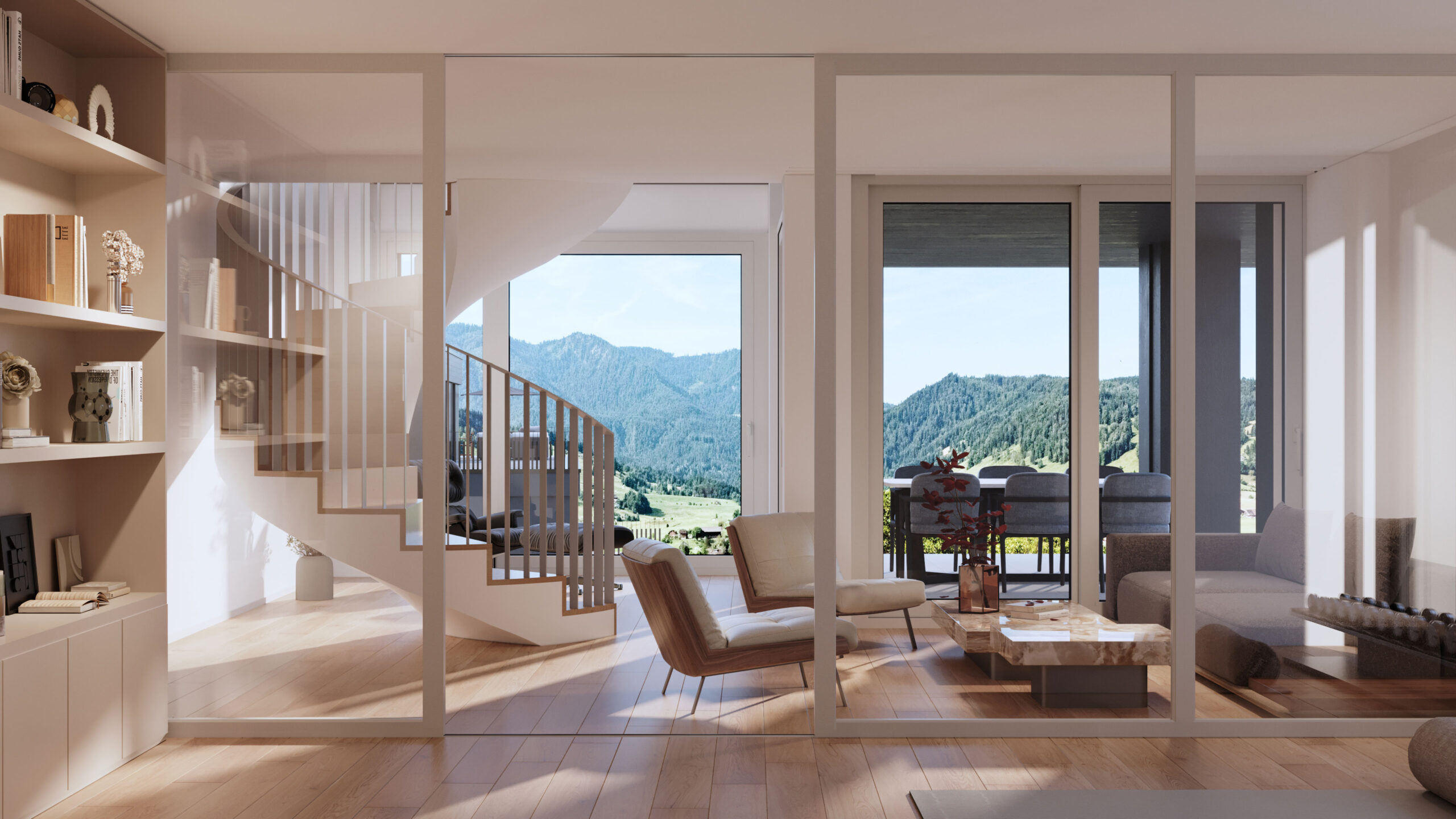 Die weit in die Umgebung ausgreifenden Balkone schaffen maximale Aussicht und erweitern den Wohnraum hinaus in die Landschaft. Die Grenze zwischen Innen und Aussen löst sich auf – sie verschmelzen miteinander.